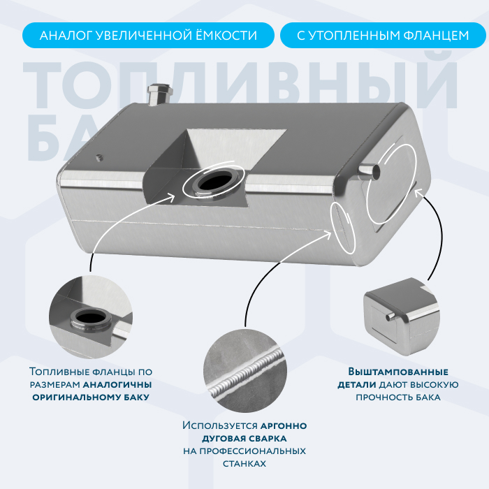 Алюминиевый бак не подвержен коррозии, что делает его более долговечным, а так же сбережет вашу топливную систему. Бак из алюминия в два раза легче стального бака, хотя он и изготовлен из листа увеличенной толщины в 2,5 мм. В конструкции предусмотрены цельные перегородки, которые проварены по периметру. Баки из алюминия так же оснащены заливной горловиной с самозапираемым непроливаемым клапаном (который становится барьером для разлива топлива, а так же становится защитой от попадания мусора в бак при открытой крышке) . Кроме того, однозначно что алюминиевый бак выглядит намного привлекательнее и дороже - где бак в том числе становиться и элементом тюнинга автомобиля. На алюминиеввые баки действует увеличенная гарантия - 36 месяцев.