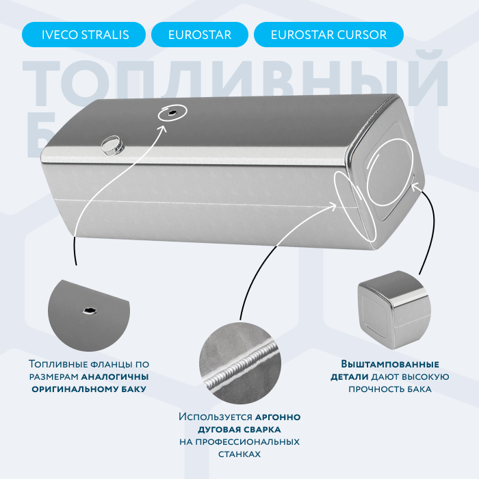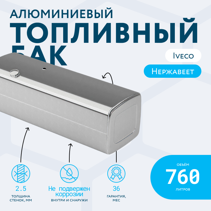 Алюминиевый бак не подвержен коррозии, что делает его более долговечным, а так же сбережет вашу топливную систему. Бак из алюминия в два раза легче стального бака, хотя он и изготовлен из листа увеличенной толщины в 2,5 мм. В конструкции предусмотрены цельные перегородки, которые проварены по периметру. Баки из алюминия так же оснащены заливной горловиной с самозапираемым непроливаемым клапаном (который становится барьером для разлива топлива, а так же становится защитой от попадания мусора в бак при открытой крышке) . Кроме того, однозначно что алюминиевый бак выглядит намного привлекательнее и дороже - где бак в том числе становиться и элементом тюнинга автомобиля. На алюминиеввые баки действует увеличенная гарантия - 36 месяцев.