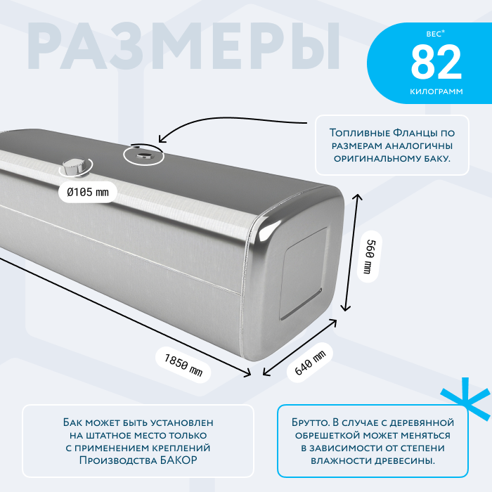 - Так же, если вы приобретаете алюминиевый топливный бак, он будет в деревянной обрешетке (для усиления защиты при транспортировке). При просчете веса и объема, цена за доставку может измениться по факту взвешивания на самом терминале транспортной компании. Так как деревянная обрешетка соответственно изготовлена из древесины, и она имеет свойство значительно набирать вес в зависимости от влажности окружающей среды.